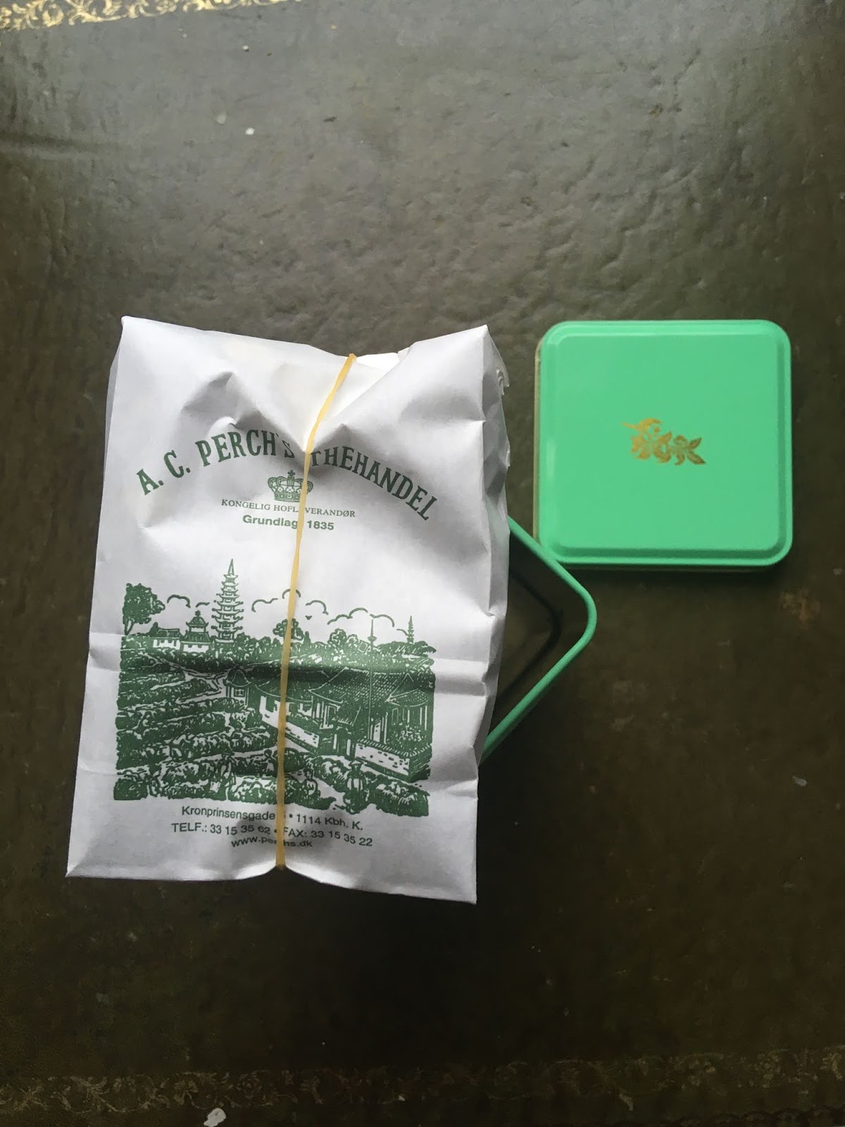 Denne teen, hvit te med ananas fra A. C. Perch's Thehandel, er en av de beste teene jeg noen gang har smakt, i tillegg til at grønnfargen på teboksen er en av mine yndlingsfarger: